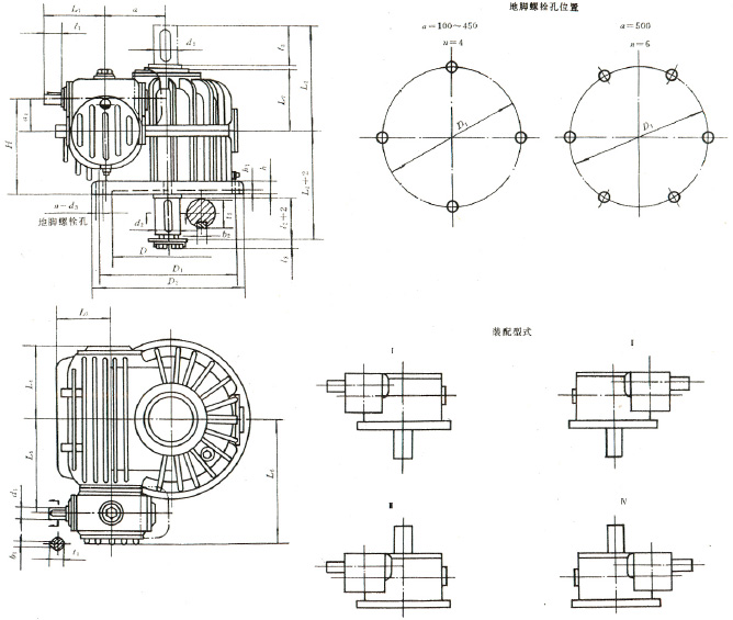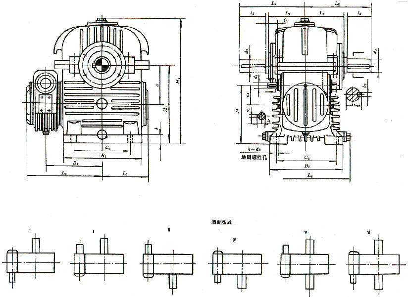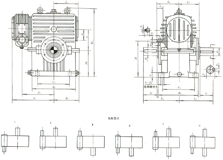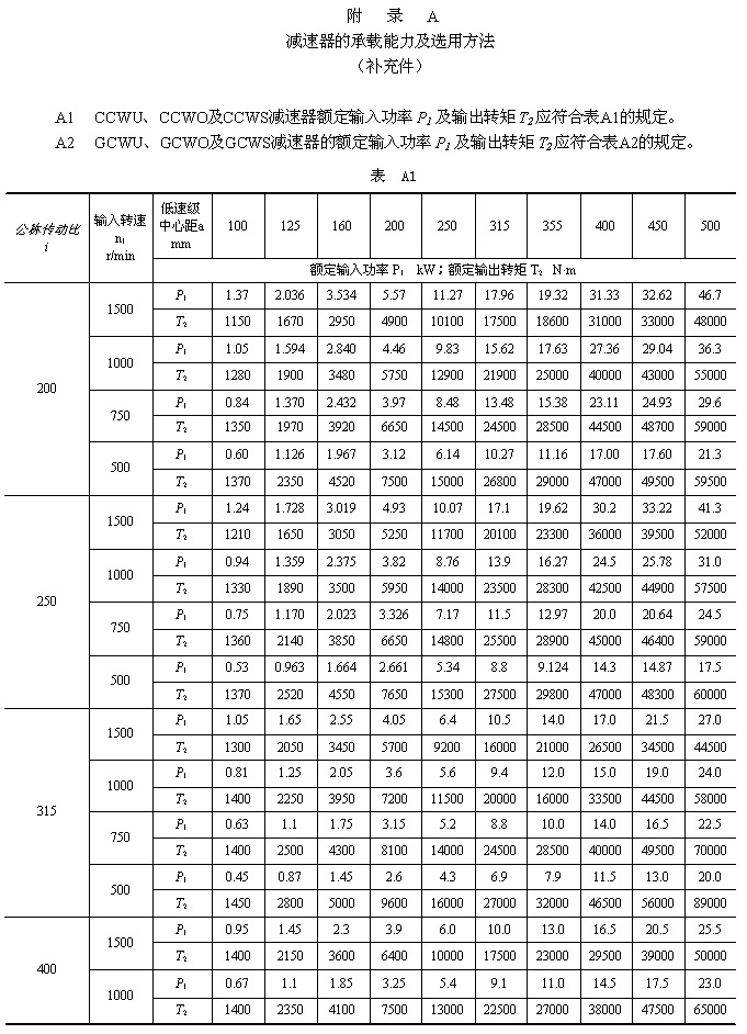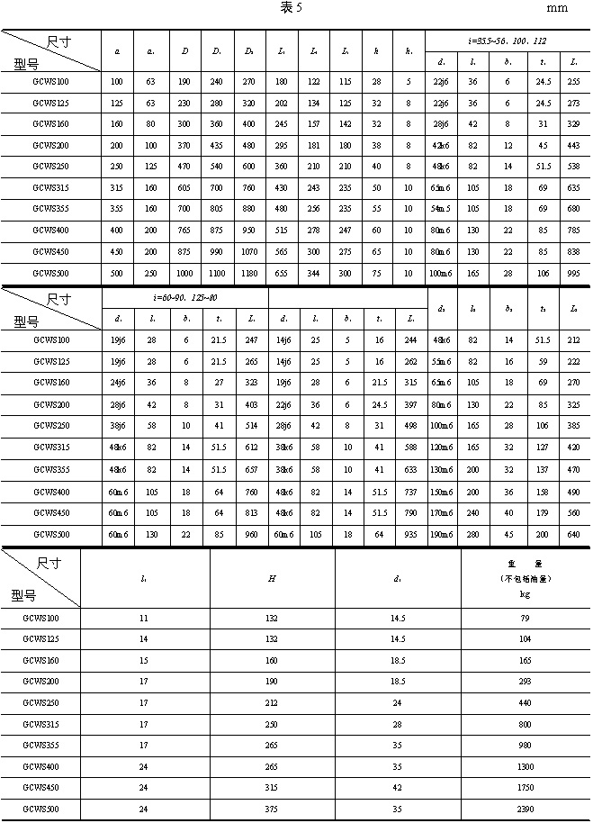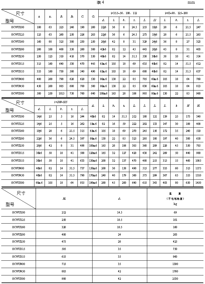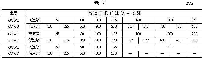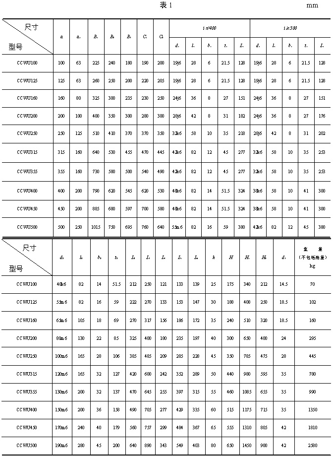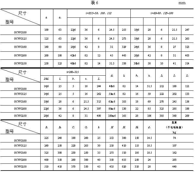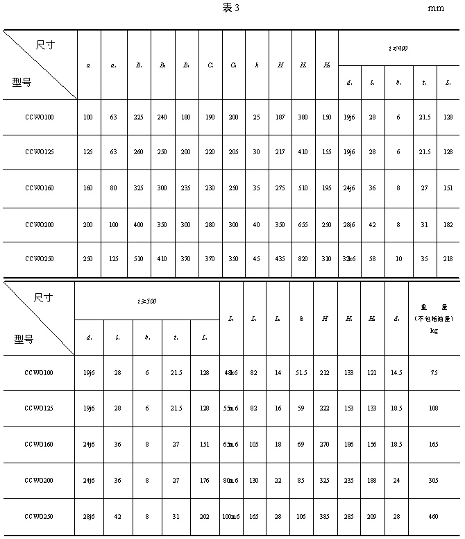 | 3、型式與尺寸 3.1 CCWU 減速器的裝配型式與外形尺寸應(yīng)符合圖1、表1的規(guī)定。 3.2 CCWS 減速器的裝配型式與外形尺寸應(yīng)符合圖2、表2的規(guī)定。 3.3 CCWO 減速器的裝配型式與外形尺寸應(yīng)符合圖3、表3的規(guī)定。 3.4 GCWU 減速器的裝配型式與外形尺寸應(yīng)符合圖4、表4的規(guī)定。 3.5 GCWS 減速器的裝配型式與外形尺寸應(yīng)符合圖5、表5的規(guī)定。 3.6 GCWO 減速器的裝配型式與外形尺寸應(yīng)符合圖6、表6的規(guī)定。 3.7 型號(hào)與標(biāo)記 3.7.1 型號(hào) CCWU:低速級(jí)蝸桿在蝸輪之下的雙級(jí)蝸桿減速器; CCWS:低速級(jí)蝸桿在蝸輪之側(cè)的雙級(jí)蝸桿減速器; CCWO:低速級(jí)蝸桿在蝸輪之上的雙級(jí)蝸桿減速器; GCWU:低速級(jí)蝸桿在蝸輪之下的齒輪—蝸輪減速器; GCWS:低速級(jí)蝸桿在蝸輪之側(cè)的齒輪—蝸桿減速器; GCWO:低速級(jí)蝸桿在蝸輪之上的齒輪—蝸桿減速器; C:表示蝸桿類別為ZC1型; G:表示齒輪; W:表示蝸桿減速器; U、S、O:分別表示低速級(jí)蝸桿位于蝸輪之下、之側(cè)、之上。 3.7.2 標(biāo)記 標(biāo)記示例: |